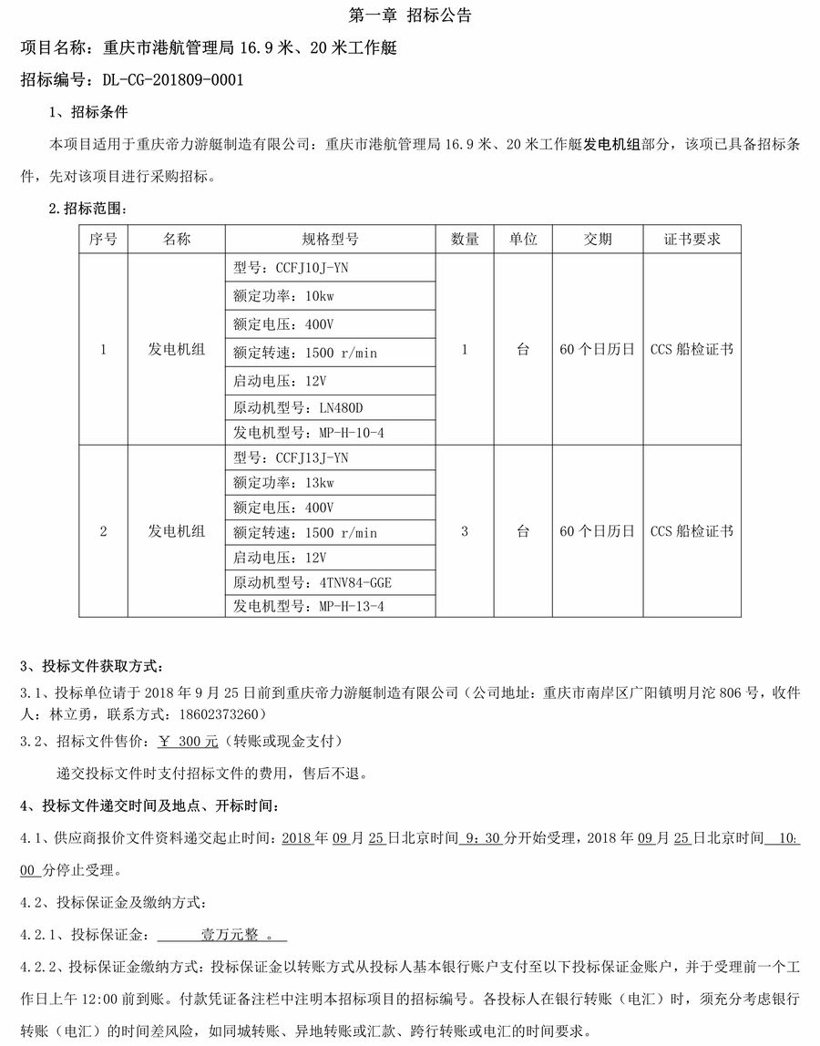 重慶市港航管理局16.9米、20米工作艇發(fā)電機(jī)組組招標(biāo)公告